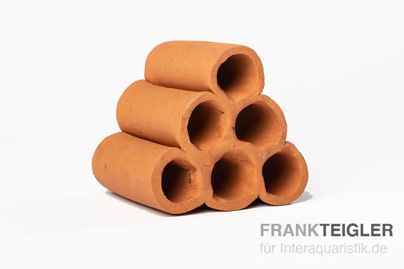 Der tönerne Röhrenturm aus dem Hause Aquariumkeramik ist aus 6 Röhren gefertigt. Eine jede der gebrannten Röhren verfügt über eine Länge von ungefähr 6 – 7 cm bei einem Durchmesser von zirka 1,5 cm. Bei der Herstellung wurde ein sogenanntes Schlickverfahren angewandt, was die zusätzliche Verwendung von Klebstoff unnötig macht.