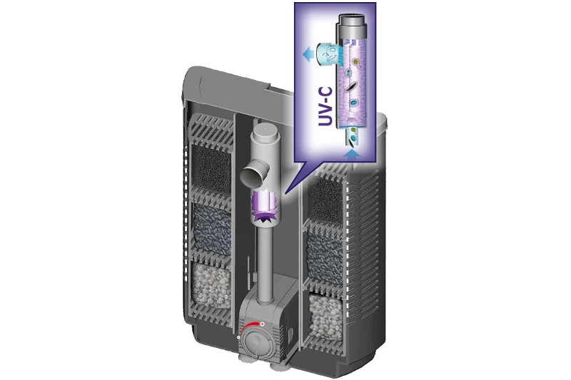 Die im Filter untergebrachten 6 Filterkörbe ermöglichen eine einfache Unterbringung, einen schnellen Wechsel/Austausch der Filtermedien und lassen sich nach oben dank herausziehbarer Halteplatten leicht entnehmen. Das gleichzeitig biologisch gereinigte und UV-C bestrahlte Wasser wird über einen flexiblen Verteiler in das Aquarium zurückgeleitet. Die flachen Ausströmdüsen sorgen für eine verbesserte Umwälzung im Aquarium.